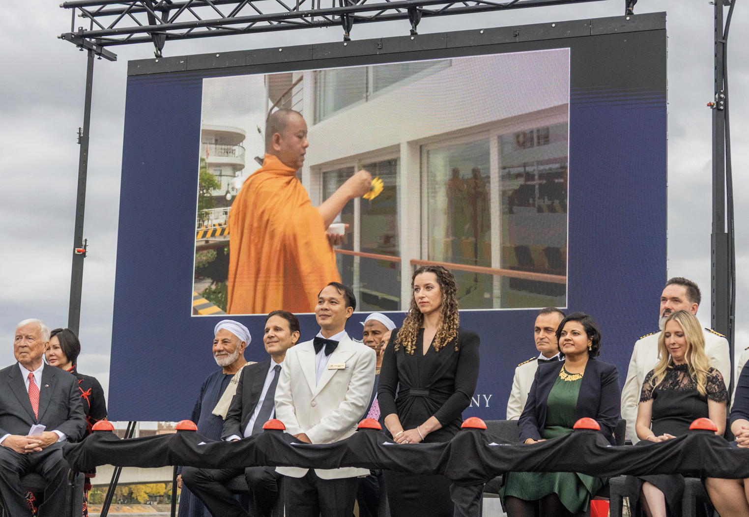 Laura Perlman, godmother of the Viking Tonle in Basel, Switzerland, as a monk offers a blessing for the ship via remote video from Mỹ Tho, Vietnam. Viking’s Chairman and CEO, Torstein Hagen, is seated on the far left of the image.
